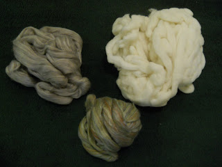 And while I did wander through the barn with the bags of fresh-shorn fleece, I did not succumb to the temptation there and limited myself to some smaller bags of washed and ready-to spin fibers. There's some lusciously soft yak and silk, some white cormo and silk (cormo is a sheep breed I haven't spun yet) and some soft green merino and silk. There seems to be a common theme here--I'm like silk like Paula Dean is about butter--it just improves everything.